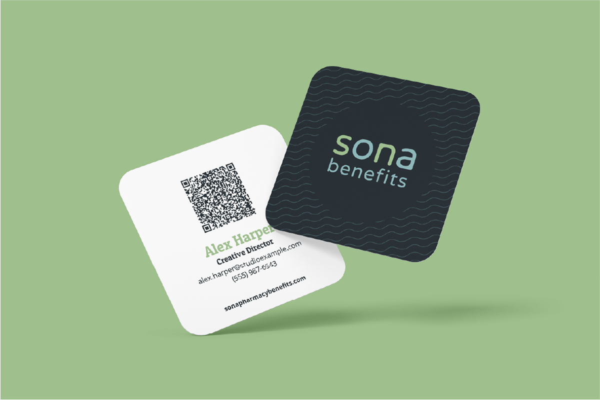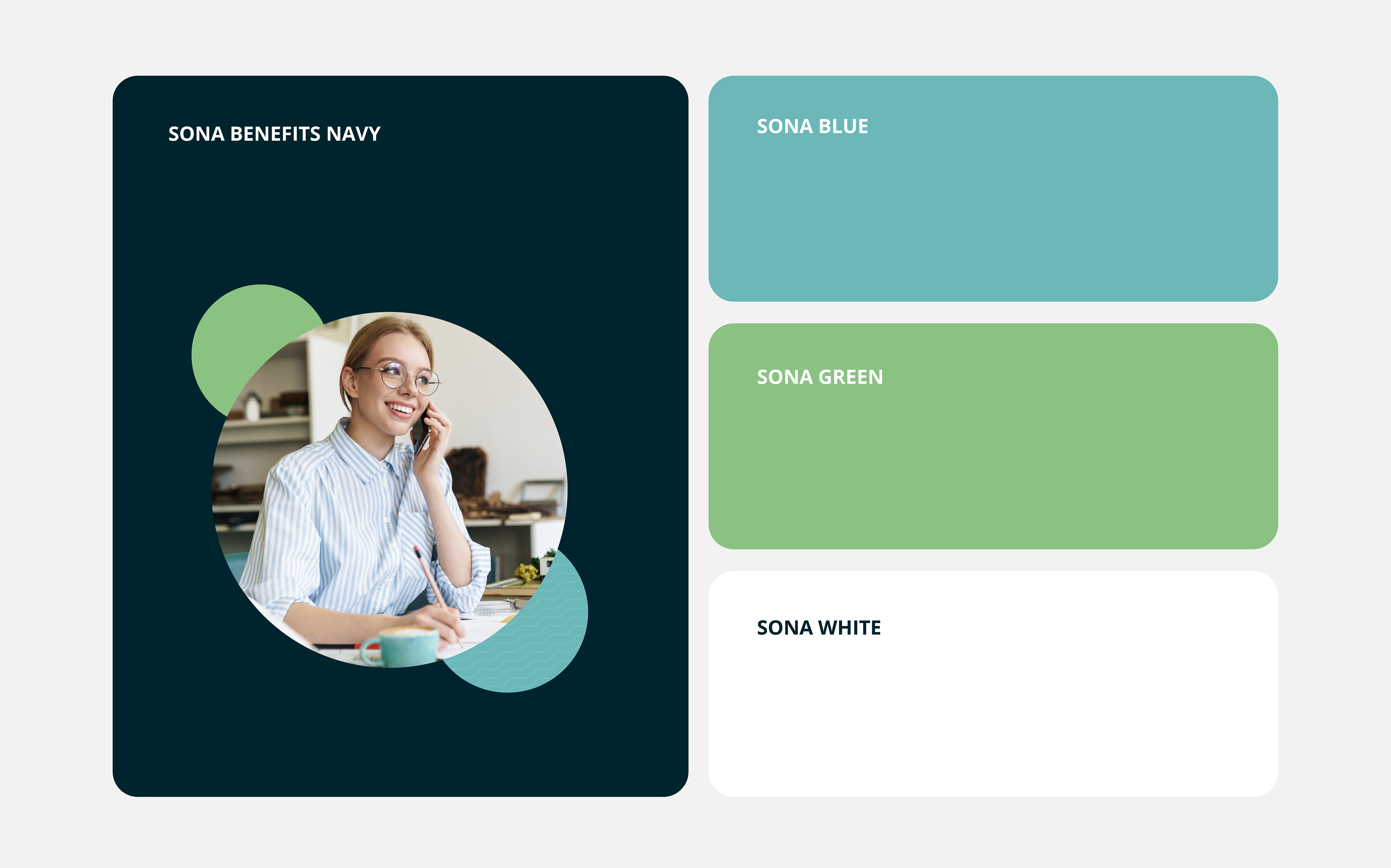 To distinguish Sona Benefits from its parent company while maintaining a visual connection, we refreshed the color palette with a bold, deep navy, complemented by the original green and blue brand colors. This approach provided a modern, distinctive look while honoring the umbrella brand’s identity.